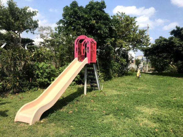 奥には、子どもたちが遊べる遊具のブランコ、滑り台、ロッキング遊具があります。